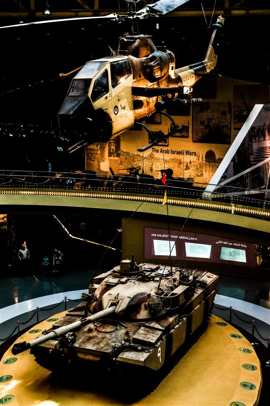 الاعتماد على إضاءة الشمس الطبيعية من خلال القبة السماوية في القاعة الرئيسية و تركيزها على المروحية و الدبابة.