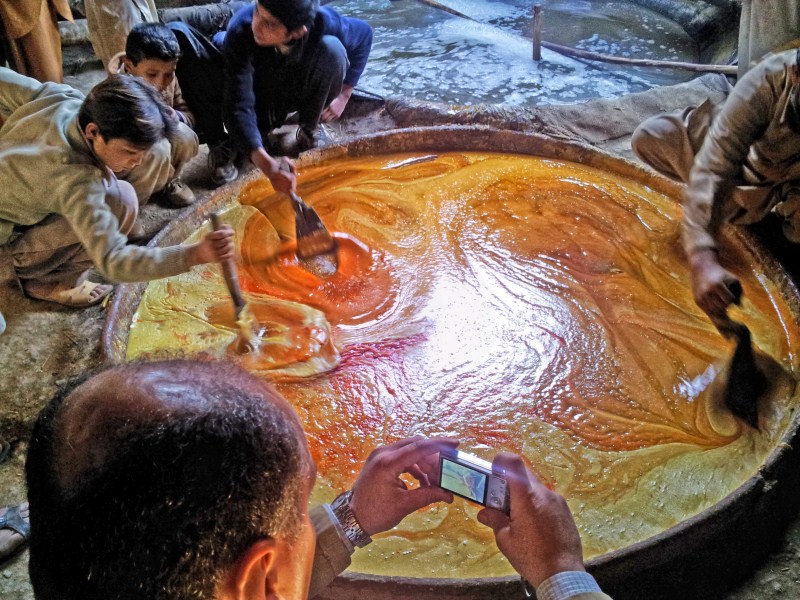 هذه الصورة صورتها اثناء تجوالي في أحد قرى باكستان الريفية و في الصورة هم يقومون بصنع نوع من انواع الحلوى الشعبية عصير قصب السكر الذي يزعونهم بانفسهم