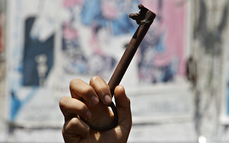 لاجئ يحمل مفناح العوده رمزا لمفتاح البيوت التى احتلت في العام 1948 وذلك خلال مهرجان للذكرى 63 لنكبة الشعب الفلسطينى