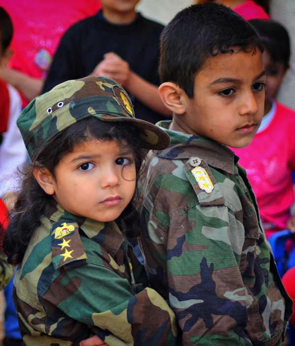 طفل وطفلة يلبسان الزي العسكري خلال حفل تخرجهم من الروضة لعام 2014