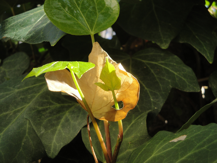 الصورة لورقة جديدة لنوع من النباتات تخترق فتحة وضعها الزمن في وقة مصفرة يابسة لتعطي لنا عبرة انا مابعد الموت هناك حياة