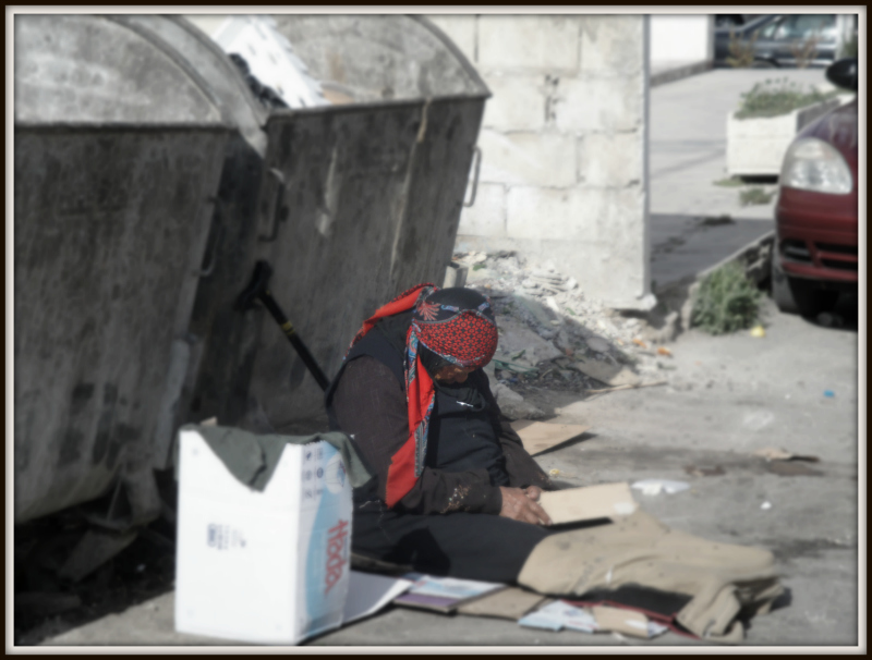 في وقت يشغل الأغنياء والمسؤولين في شراء السيارات الفارهة والبحث عن الأموال تفترش هذه السيدة العجوز بلباسها الأردني التقليدي الأرض بجانب حاوية قمامة في شارع الجاردنز في انتظار " غنيمة" قد يلقي بها احد الأغنياء في حاوية القمامة.