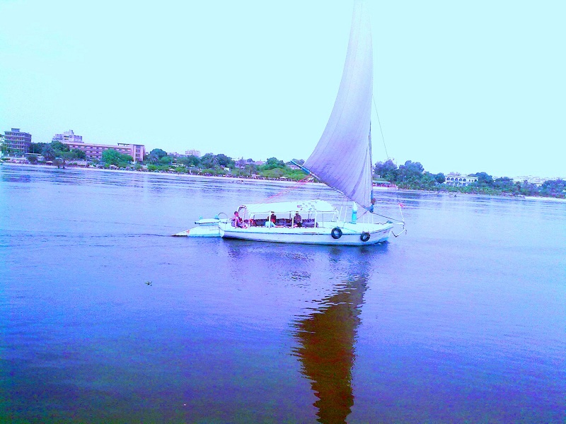 وسطوع الشمس على نهر النيل مما يعكس ظل المراكب الشراعيه على الماء