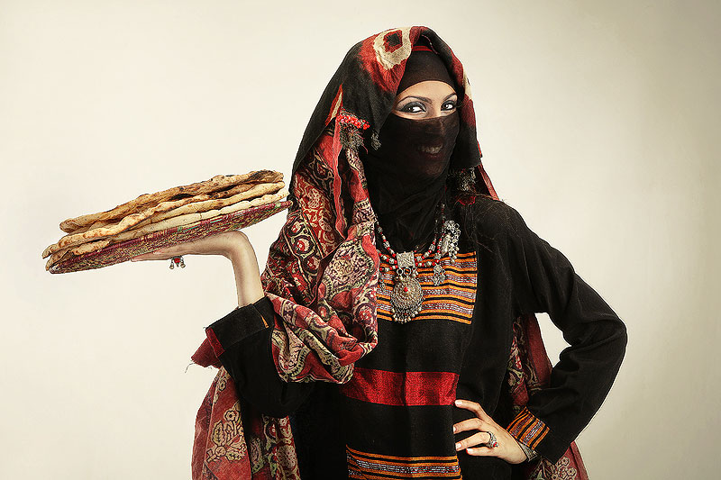 فتاة من صنعاء القديمة ترتدي الزي التقليدي لنساء صنعاء وتحمل في يدها الخبز البلدي