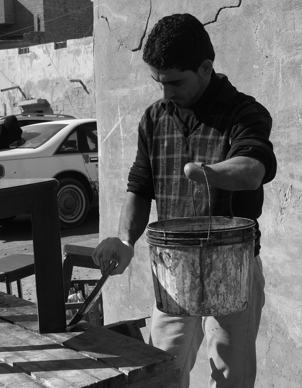 واضح ان موضوعك هو تحدي وتصميم هذا الإنسان من زاوية وإضاءة الصورة حيث طريقة امساكه بالفرشاة وعمله غير صحيحه. والأهم لم ار من قبل من يعمل في البويا أو الدهان يستمر بحمل الدلو أثناء عمله. 2012/02/03