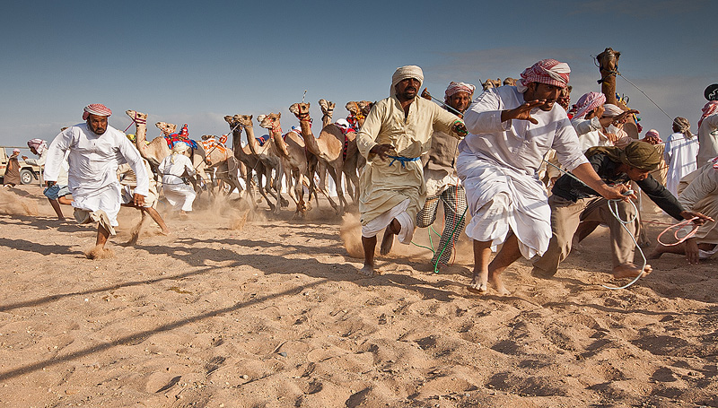 مسابقة للجمال وهنا يفلت البدو الحبال التي تمسك الجمال فتنطلق مسرعه ويبدو الخوف على ملامحهم بسبب قوة اندفاع الجمال