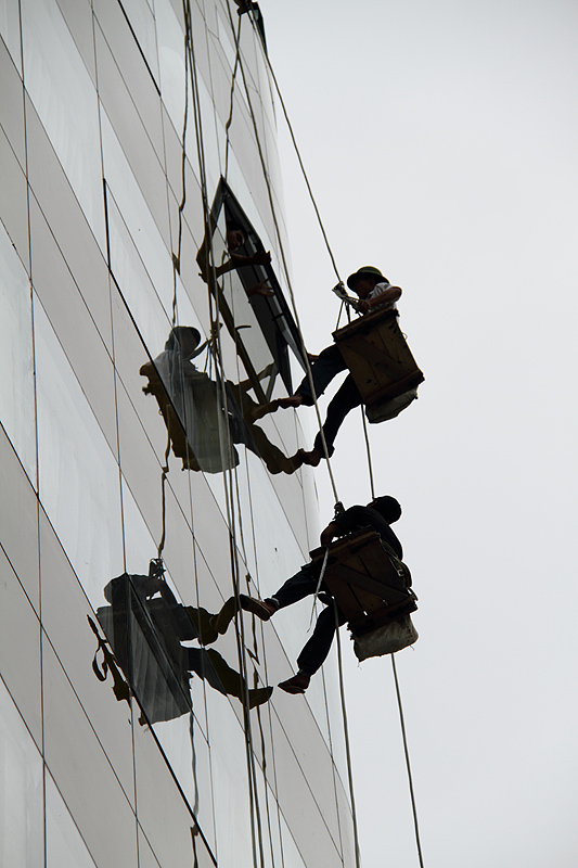 عند جلوسي في الصباح الباكر انتظر باص الرحلة في مؤتمر FIAP في حديقة الفندق لفت انتباهي اعلى الفندق العاملين يقومان بتنظيف النوافذ ولكن تضاد وانعكاس جسدهم على زجاج الفندق وتضاد موقعهن واحد بالاعلى والاخر بالاسفل اوحى لي بانهن يقمن بعمل وجهد مضاعف نتيجة ارتفاعهم العالي جدا