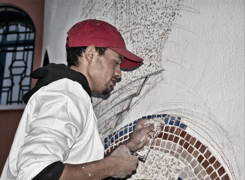 طالب متمدرس في حرفة الزخرفة والفسيفساء أثناء قيامه بعمله.