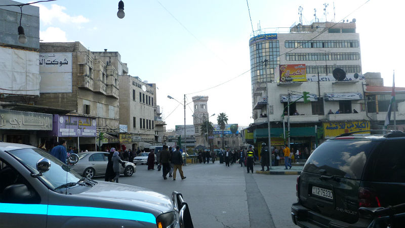 في هذه الصورة، يظهر الحراك اليومي على تقاطع شارع الهاشمي وامتداد شارع الحصن، وهذه المنطقة حول دوار الساعة هو المكان الأكثر حيوية في البلد من حيث المارّة، سواء أناس أو سيارات.