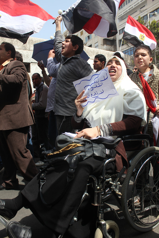 تم اقتباس الصورة من امام مسجد القائد ابراهيم بالاسكندرية , حيث خرج الرجال والشباب والنساء , وها هنا احدى النساء ولكن ليست ككل النساء فهى مشلولة ومريضة ولكن خرجت لتطالب بحقها