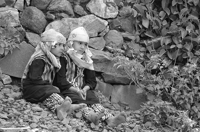 الصورة لطفلتين ريفيتين في حالة إرتياح بعد القيام بجمع الأعلاف للحيوانات