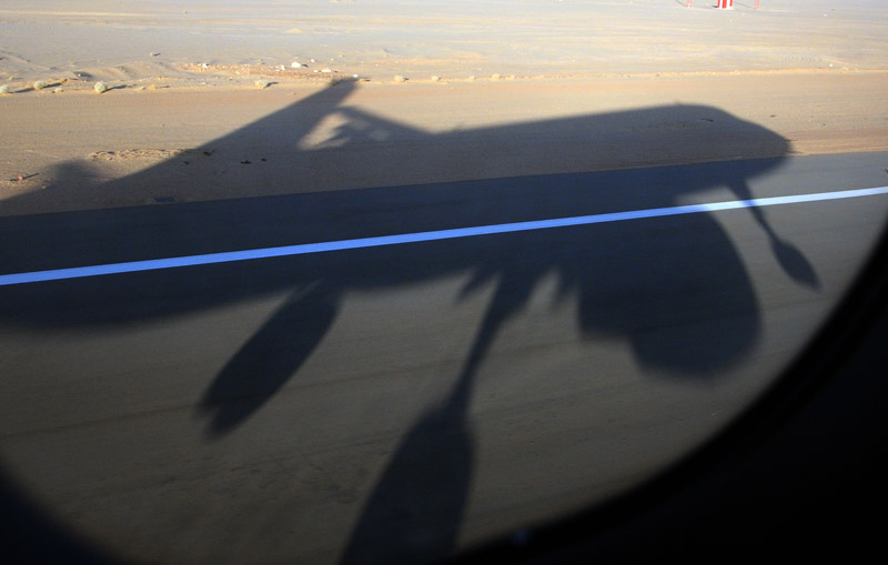 التقطت ظلال هذه الطائرة لحظة هبوطها بمدرج المطار من خلال نافذة الطائرة